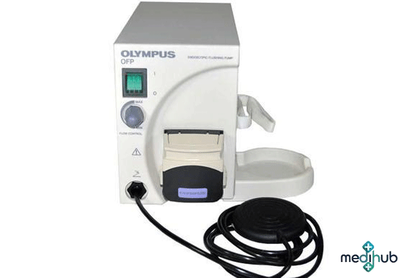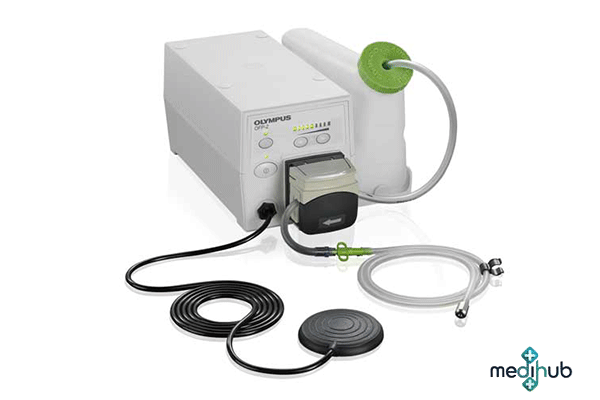 Bomba de irrigación con tasa de flujo potente y controlada. Puede irrigar fluido a través del canal de trabajo o el canal auxiliar de agua de los endoscopio. El llenado rápido de los órganos permite la EUS. Manejo mediante control remoto o pedal.